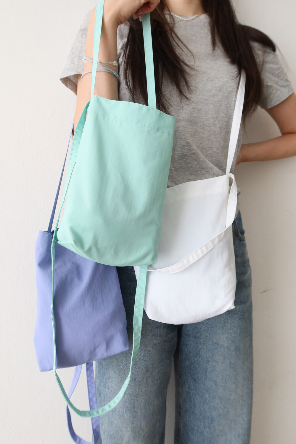 서로 다른 길이의 두 개의 끈이 있어 숄더, 크로스로 착용할 수 있습니다.